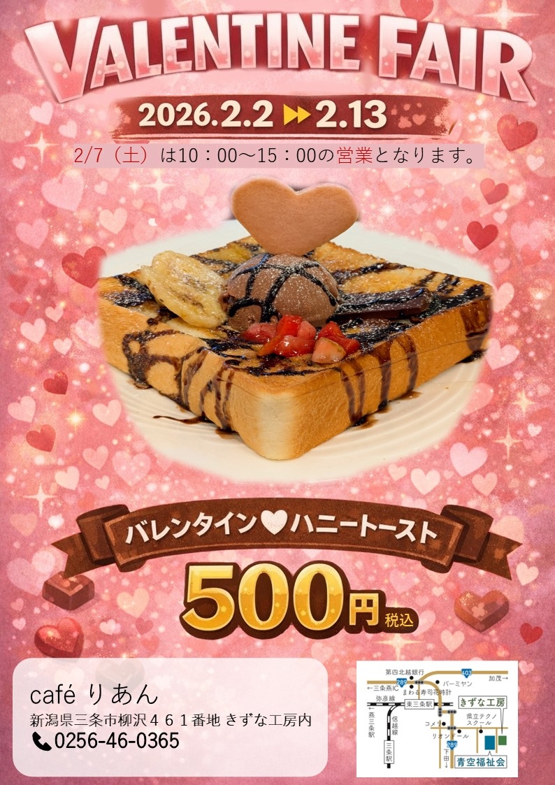 caféりあんでは2月2日(月)から2月13日(金)までバレンタイン限定メニューをご用意しております(^^♪